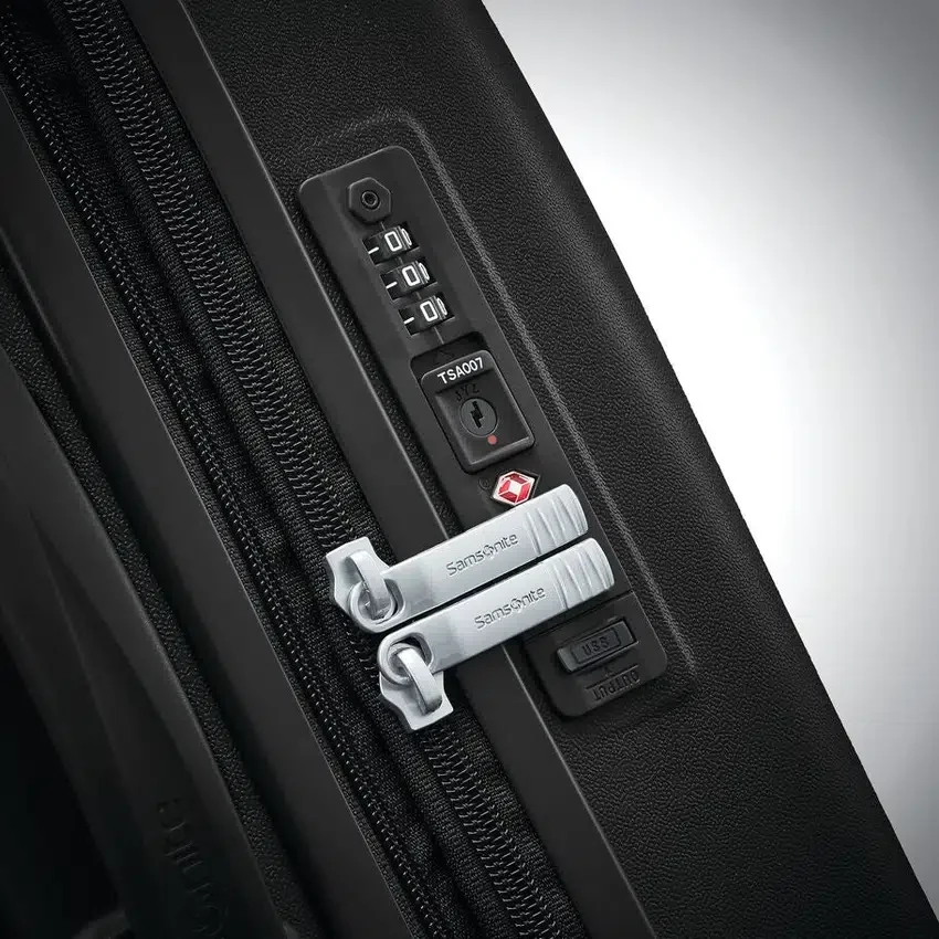 Der USB-Anschluss mit Schutzabdeckung ist in das TSA-zugelassene Schlossfeld integriert und sorgt für ein stromlinienförmiges Design und bequemes Aufladen (Akku nicht im Lieferumfang enthalten)