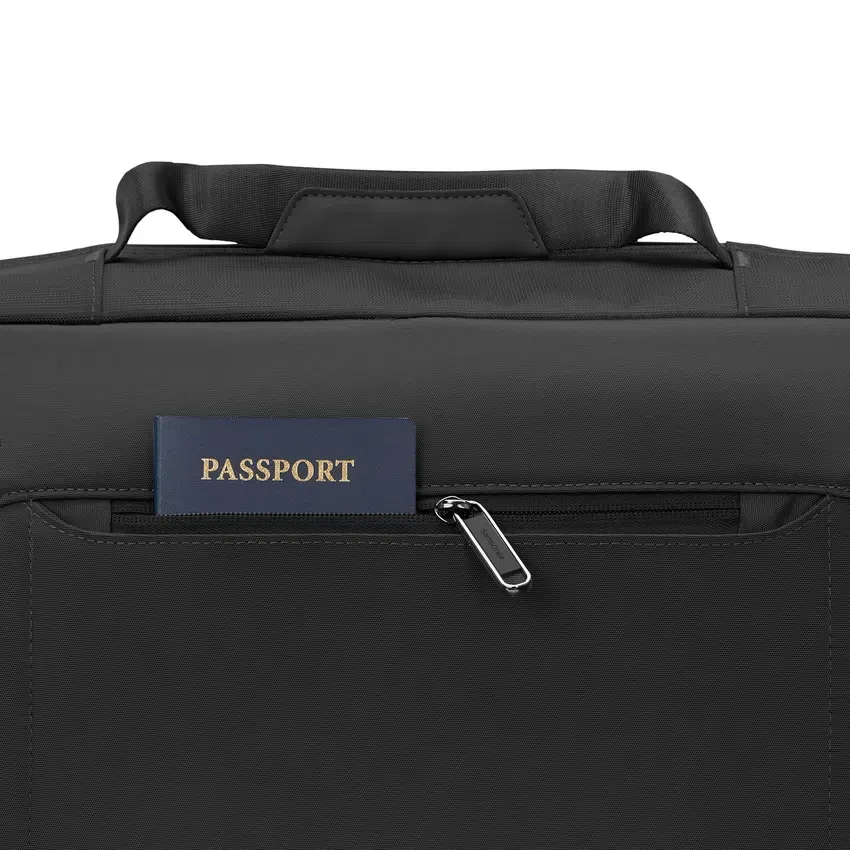 - Eine Fronttasche mit schnellem Zugriff, damit Sie Ihre Reiseunterlagen ordentlich verstauen können